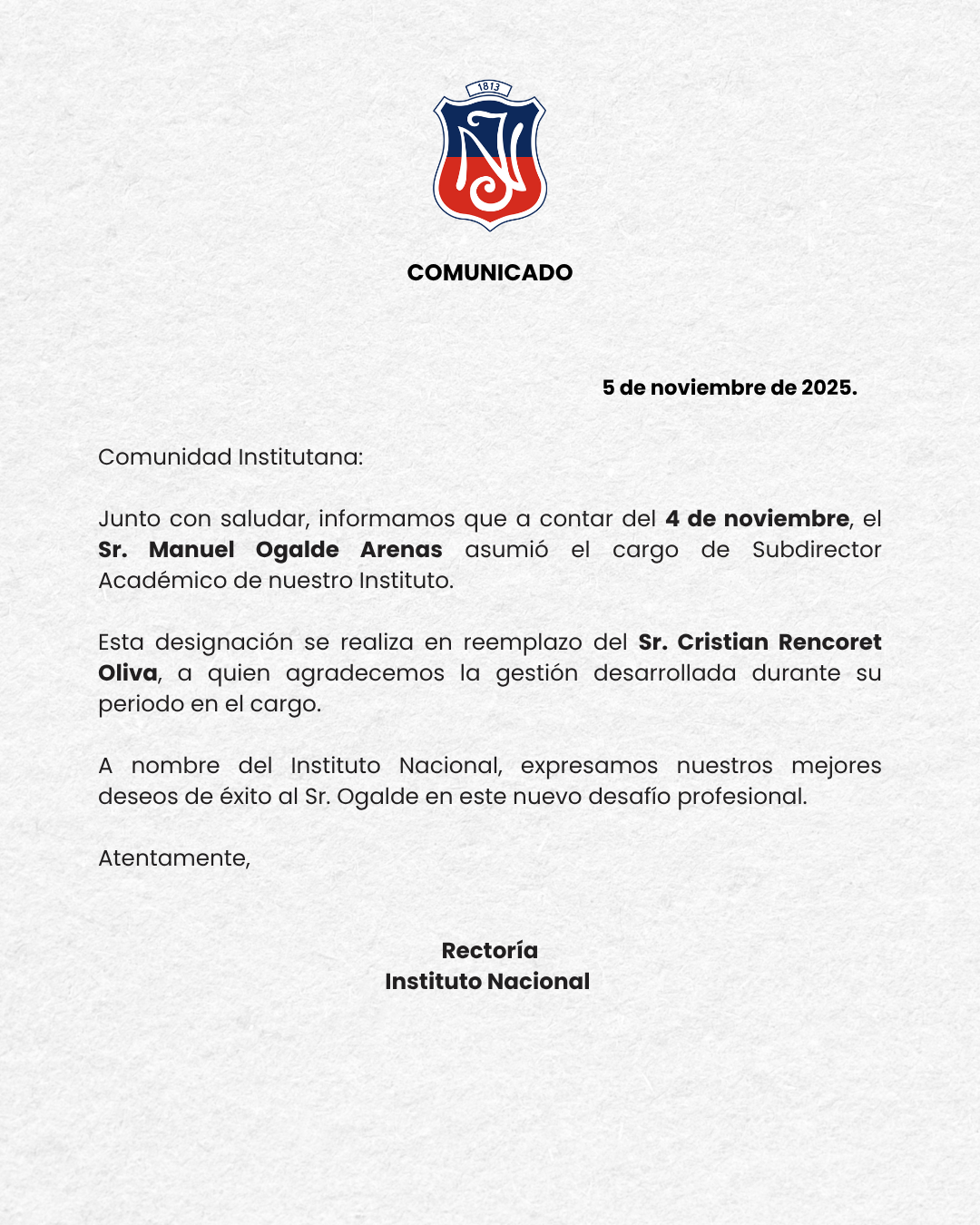 A nombre del Instituto Nacional, expresamos nuestros mejores deseos de éxito al Sr. Ogalde en este nuevo desafío profesional.