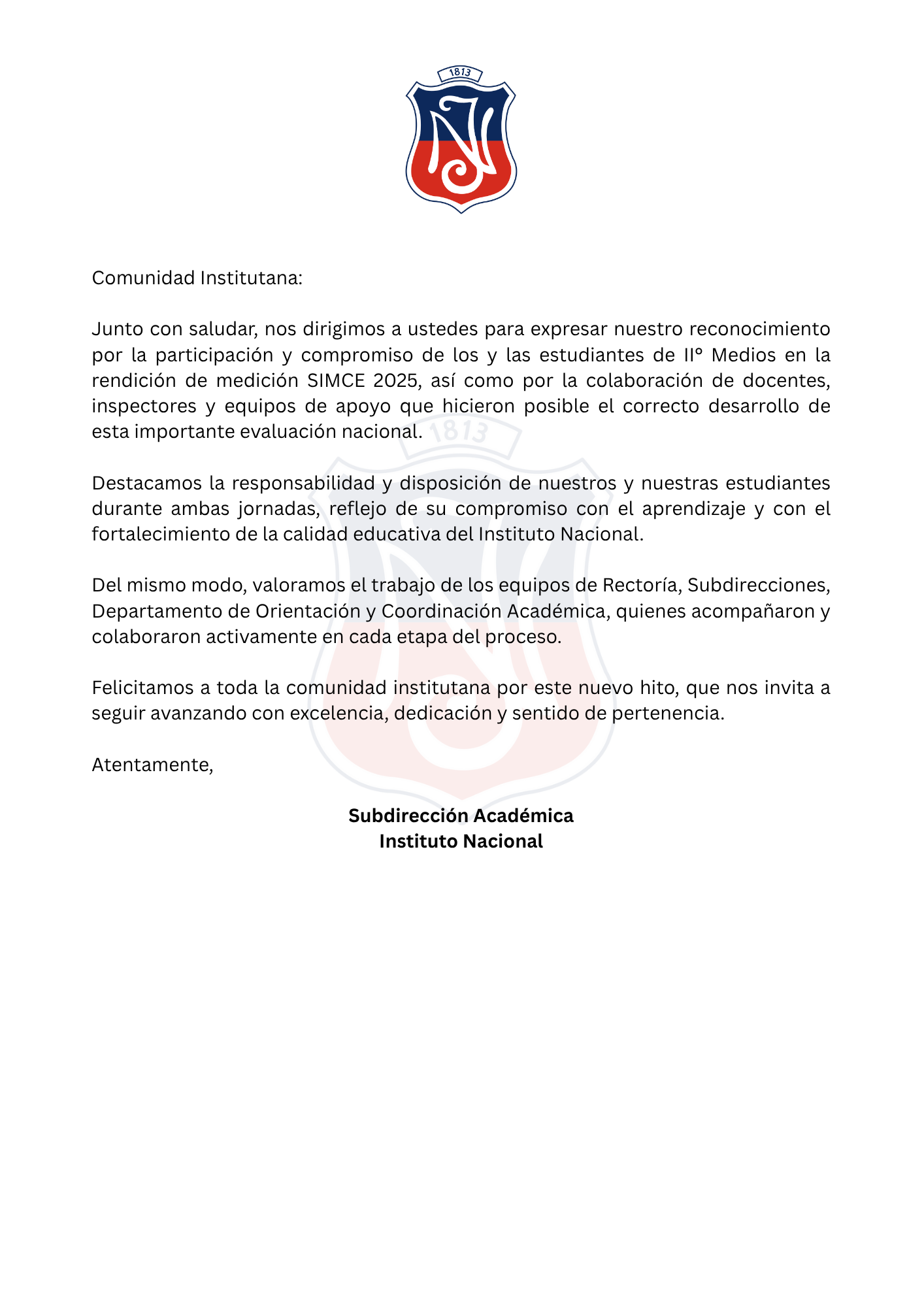 Junto con saludar, nos dirigimos a ustedes para expresar nuestro reconocimiento por la participación y compromiso de los y las estudiantes de II° Medios en la rendición de medición SIMCE 2025, así como por la colaboración de docentes, inspectores y equipos de apoyo que hicieron posible el correcto desarrollo de esta importante evaluación nacional.