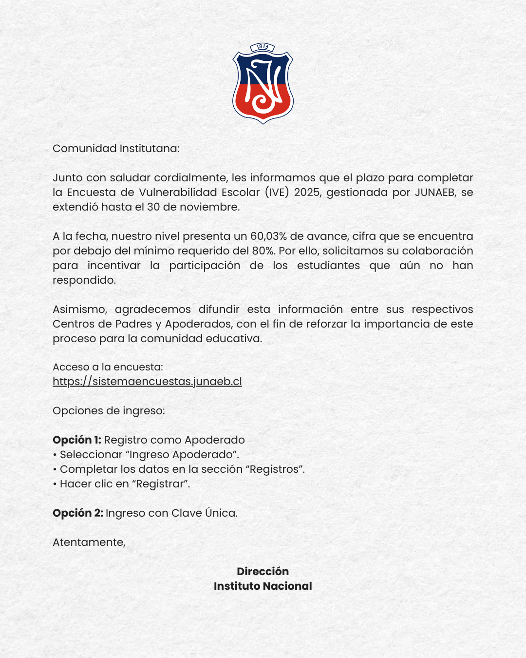Junto con saludar cordialmente, les informamos que el plazo para completar la Encuesta de Vulnerabilidad Escolar (IVE) 2025, gestionada por JUNAEB, se extendió hasta el 30 de noviembre.