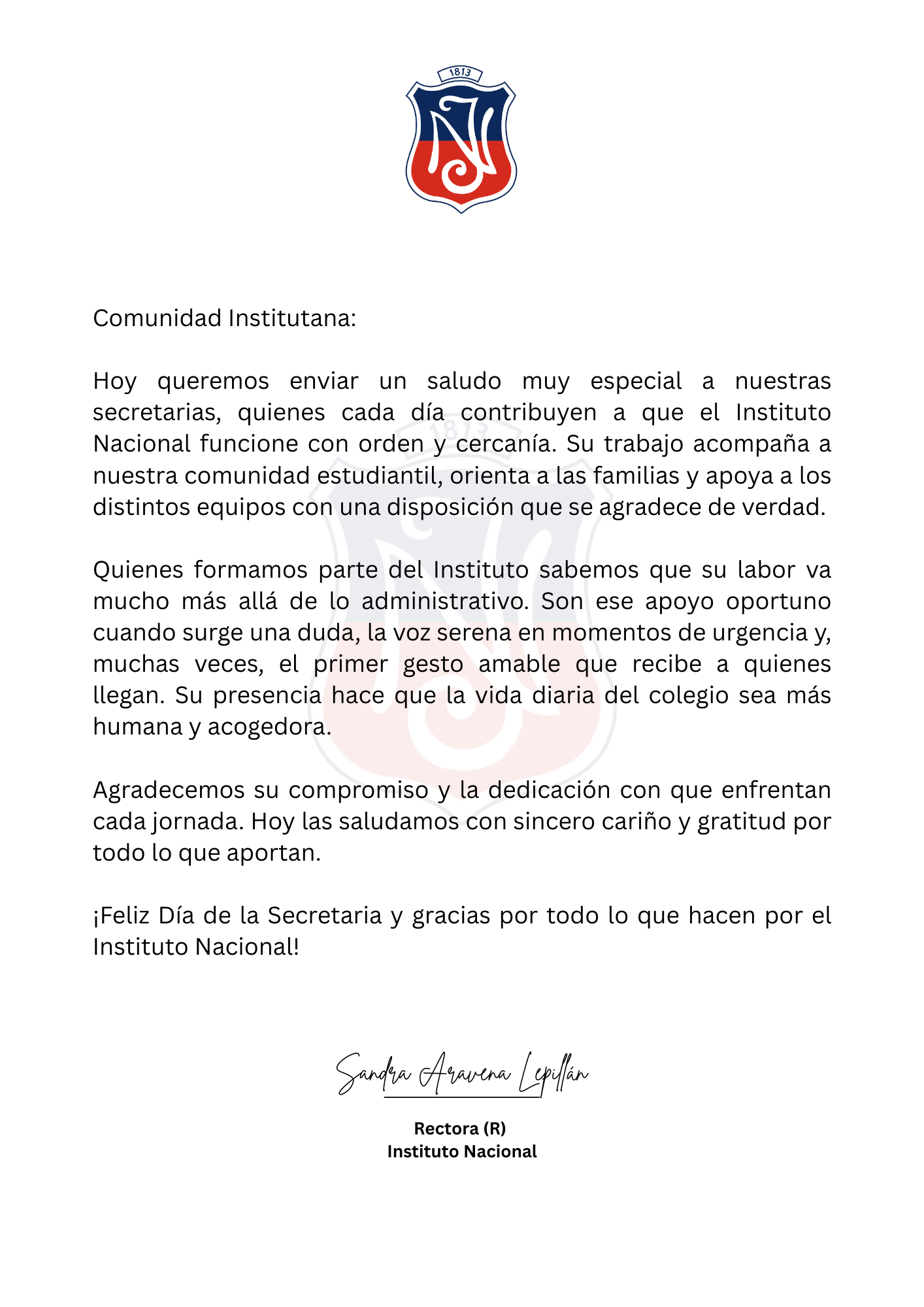 Hoy queremos enviar un saludo muy especial a nuestras secretarias, quienes cada día contribuyen a que el Instituto Nacional funcione con orden y cercanía. Su trabajo acompaña a nuestra comunidad estudiantil, orienta a las familias y apoya a los distintos equipos con una disposición que se agradece de verdad.